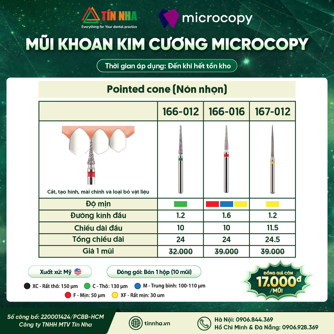 Thương hiệu: Microcopy Sản Xuất: Mỹ Công dụng: Cắt, tạo hình, mài chỉnh và loại bỏ vật liệu Đóng gói: Bán 1 hộp (10 mũi) Liên hệ ngay với Tín Nha để nhận báo giá và chương trình ưu đãi